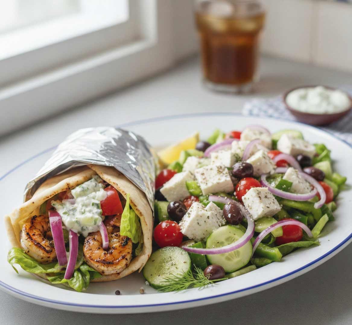 Grilled marinated shrimp gyro wrapped in a seasoned pita with fresh veggies and house-made tzatziki, paired with a classic Greek salad topped with traditional dressing.