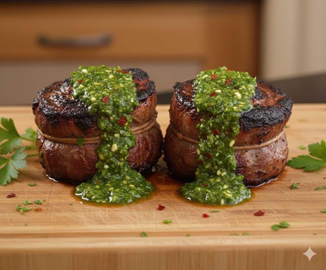 2 Grilled skirt steak rolls with chimichurri sauce.